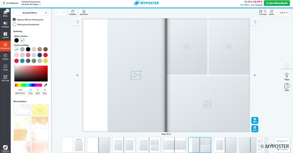 Nun stehen die Bilder zwar auch dann noch zur Verfügung, wenn man die Seite schließt und im gleichen Browser später wieder zu Myposter wechselt, ein erstelltes Projekt dauerhaft zu speichern oder plattformübergreifend daran zu arbeiten, ist jedoch nur mit einem Benutzerkonto möglich.