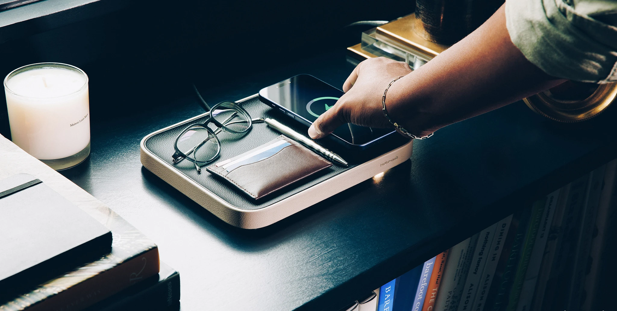 Die Oberfläche besteht aus Nappa-Leder und bietet Platz für Gegenstände wie Schlüssel, Uhr, Geldbörse oder Smartphone. In die Ablage ist eine Qi2-kompatible Ladefläche integriert, die unterstützte Geräte mit bis zu 15 Watt kabellos mit Energie versorgt. Dazu zählen unter anderem iPhones oder kabellose Kopfhörer wie AirPods. Ergänzend befindet sich unterhalb der Basis ein zusätzlicher USB-C-Anschluss mit ebenfalls bis zu 15 Watt Leistung, über den ein weiteres Gerät wie eine Smartwatch, ein Tablet oder ein E-Reader geladen werden kann.