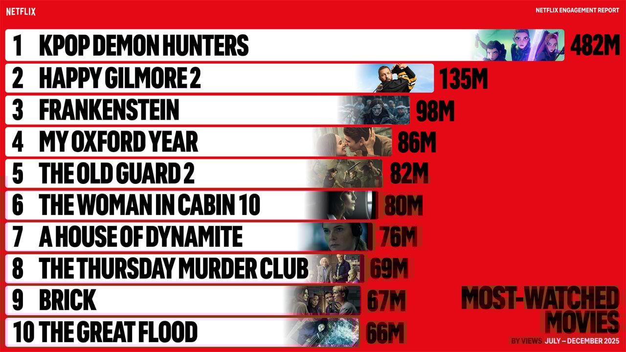 Zwischen Juli und Dezember 2025 sammelte „KPop Demon Hunters“ fast eine halbe Milliarde Views. Damit ließ der Film nicht nur andere Kinotitel, sondern auch Serienhits weit hinter sich. Selbst erfolgreiche Neustarts wie „Happy Gilmore 2“, die mit einem starken Start aufwarteten, konnten in diesem Zeitraum nicht ansatzweise mithalten.
