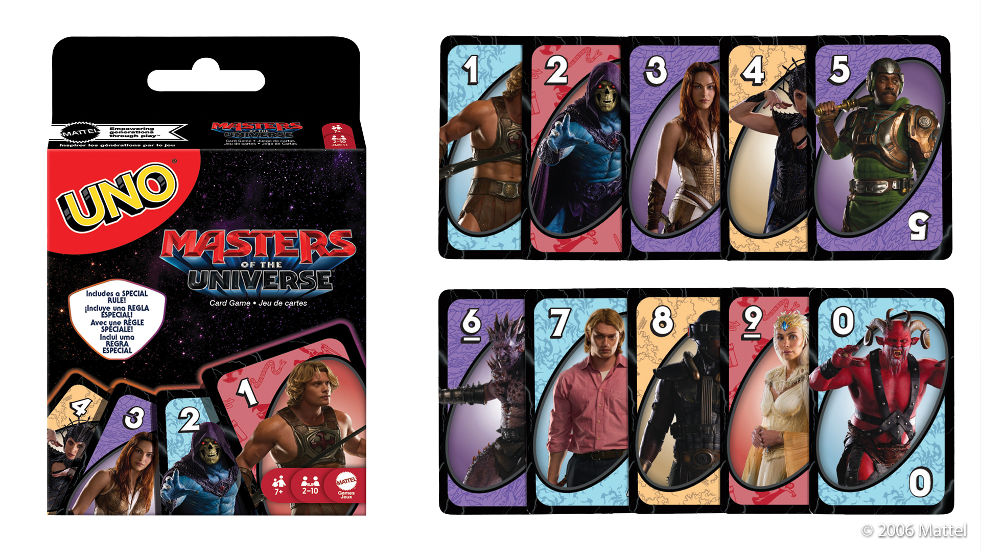 Wer es kleiner mag, findet Funko Pop!-Vinylfiguren der wichtigsten Charaktere, darunter He-Man, Skeletor, Teela und Man-At-Arms. Hot Wheels bringt He-Man und Skeletor als Fahrer von 1:64-Die-Cast-Fahrzeugen in den Handel, Mattel Brick Shop liefert ein baubares Snake-Mountain-Set mit Lavaeffekten und zwölf NanoWorld-Figuren. Selbst das Kartenspiel UNO bekommt eine Filmversion, inklusive einer speziellen „Schwert der Macht“-Regel.