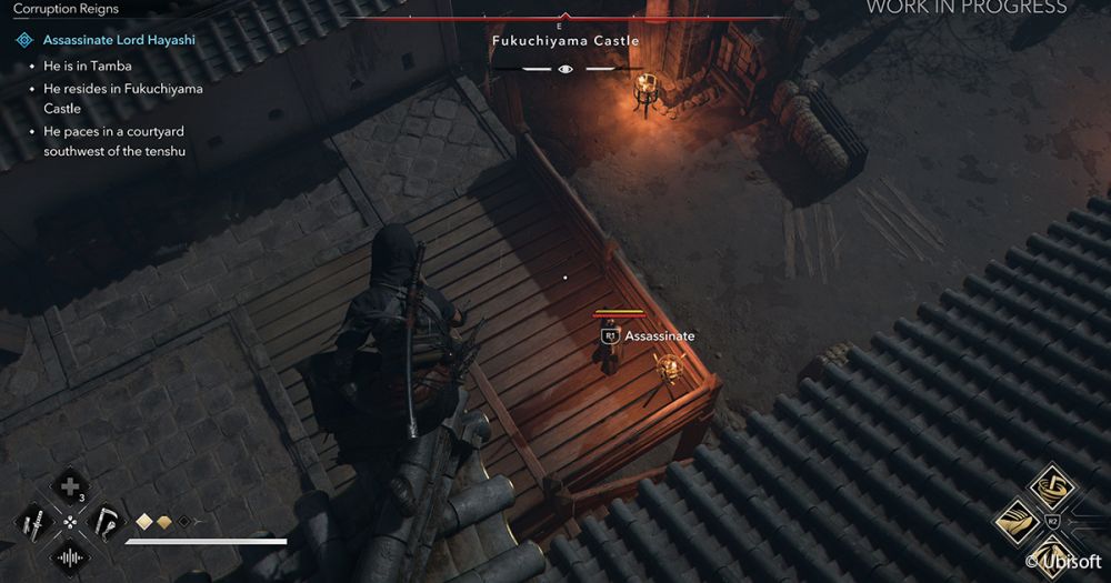 Im offenen Kampf ist Naoe im Vergleich zu ihrem Krieger-Kumpel ganz klar im Nachteil. Diesen gleicht sie jedoch effektiv mit einem praktischen Kletterhaken und der berühmten versteckten Klinge aus, um aus den Schatten heraus Attentate auf ihre Opfer zu verüben. Hohes Gras, Büsche oder auch die Dunkelheit sind weitere Werkzeuge, die uns dabei helfen, den Feind zu überraschen. Naoe-Exklusiv ist außerdem die Adlersicht, dank der wir Gegner auch durch Wände hindurch hervorheben und anschließend zur weiteren Beobachtung markieren.