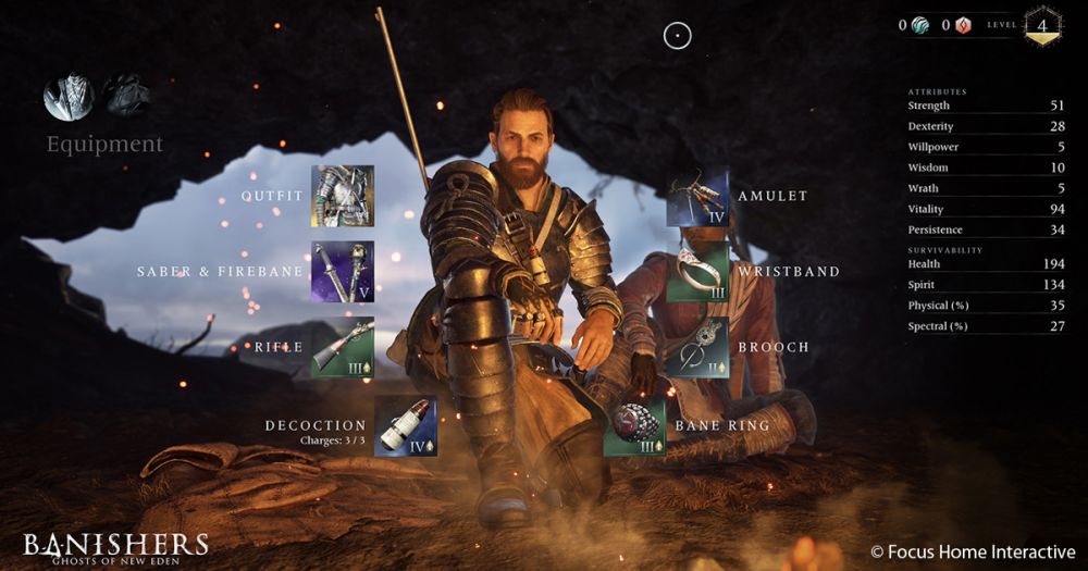 Zwar kommt Banishers: Ghosts of New Eden auf den ersten Blick als Third-Person-Action daher, im Hintergrund definieren aber diverse Zahlenwerte, wie gut wir austeilen, einstecken oder uns erholen. Die Werte steigen schlicht durch Levelaufstiege, oder auch durch das Anlegen besserer Ausrüstung, die wir durch gesammelte Ressourcen während unserer Rast am Lagerfeuer auch noch in mehreren Stufen verbessern können.