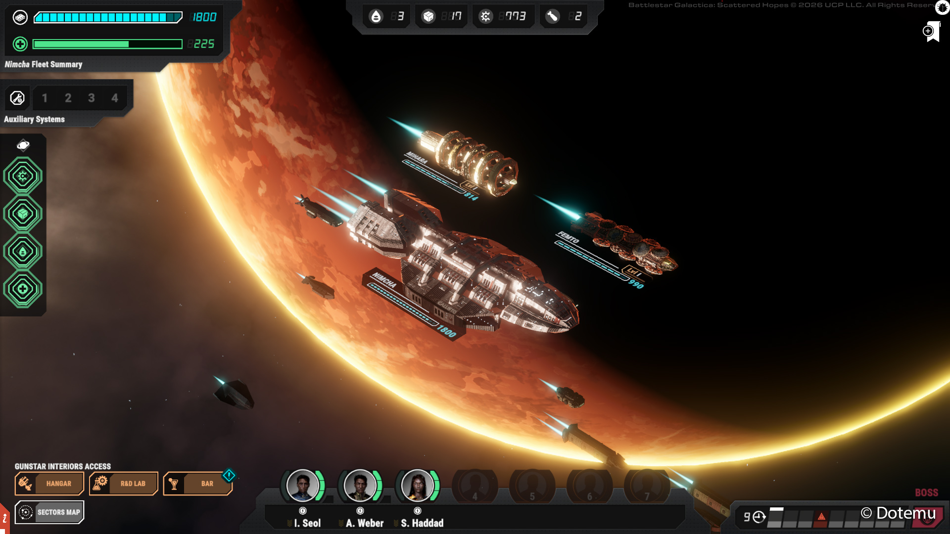 Kommt es zur Konfrontation mit den Zylonen, stehen hybride Gefechte im Mittelpunkt. Kampfflugzeuge werden aus Hangars entsendet und in Echtzeit gesteuert, während taktische Entscheidungen über Verteidigung und Schadensbegrenzung getroffen werden. Zentrales Ziel ist es, lange genug standzuhalten, um einen Sprung in einen neuen Sektor vorzubereiten. Dieses Überlebensprinzip orientiert sich an der Dramaturgie der Pilotfolge „33“ der Serie, in der es um das Durchhalten bis zum nächsten Hyperraumsprung geht.