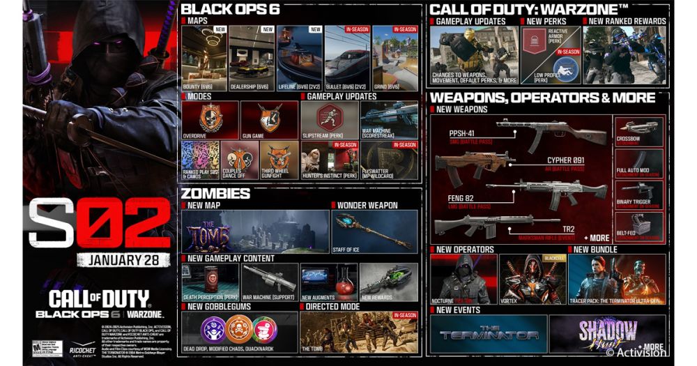 Für alle Spielmodi werden zehn neue Waffen eingeführt, darunter das Sturmgewehr Cypher 091, die MP PPSh-41, das LMG Feng 82 und das DMR TR2. Weitere Nahkampfwaffen werden Mitte der Season hinzukommen. Der neue Battle Pass sowie BlackCell bieten eine Vielzahl neuer Inhalte, darunter Operator-Skins, Waffenbaupläne und mehr. Auch die neuen Operator Vortex (BlackCell) und Nocturne (Battle Pass) werden das Schlachtfeld bereichern. Zusätzlich gibt es ein exklusives Terminator-Bundle im Shop.