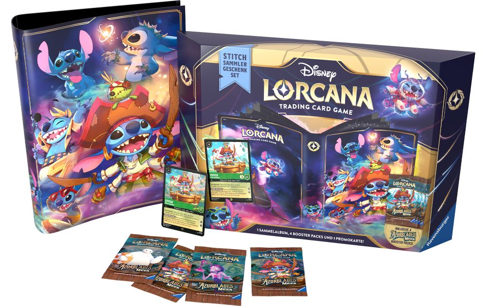 Für Disney Fans und Sammler ist das Stitch Sammler Geschenk Set ein absolutes Highlight. Es enthält vier „Azurblaues Meer“- Booster Packs sowie eine exklusive Stitch Promokarte mit einem einzigartigen Foiling. Zusätzlich bietet ein Sammelalbum ausreichend Platz, um die Karten stilvoll aufzubewahren und zu präsentieren.