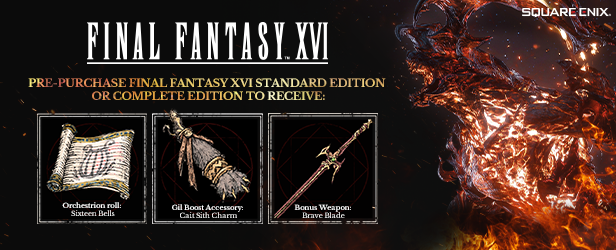 Kunden, die Final Fantasy XVI bis zum 17. Oktober 17:00 Uhr über Steam oder den Epic Games Store kaufen, erhalten exklusive DLC-Inhalte wie die Waffe Mutklinge, den Cait-Sith-Talisman für einen Gil-Boost und die Notenrolle „Sixteen Bells“.