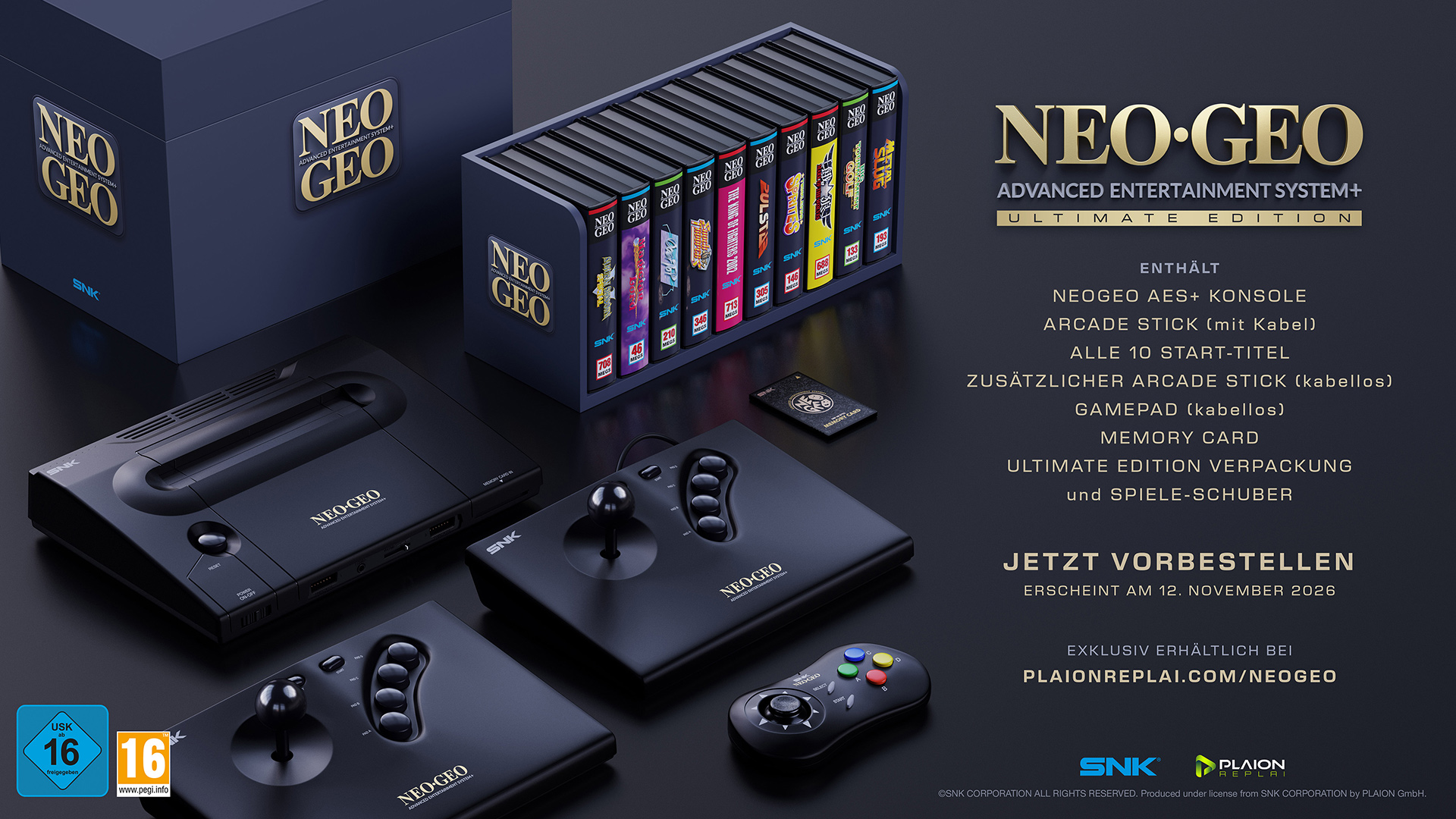Das „Neogeo AES+“ erscheint am 12. November 2026 in einer Standard Edition zum Preis von 199,99 Euro sowie in einer 35th Anniversary Edition für 299,99 Euro. Einzelne Spiele-Cartridges werden voraussichtlich jeweils 79,99 Euro kosten.