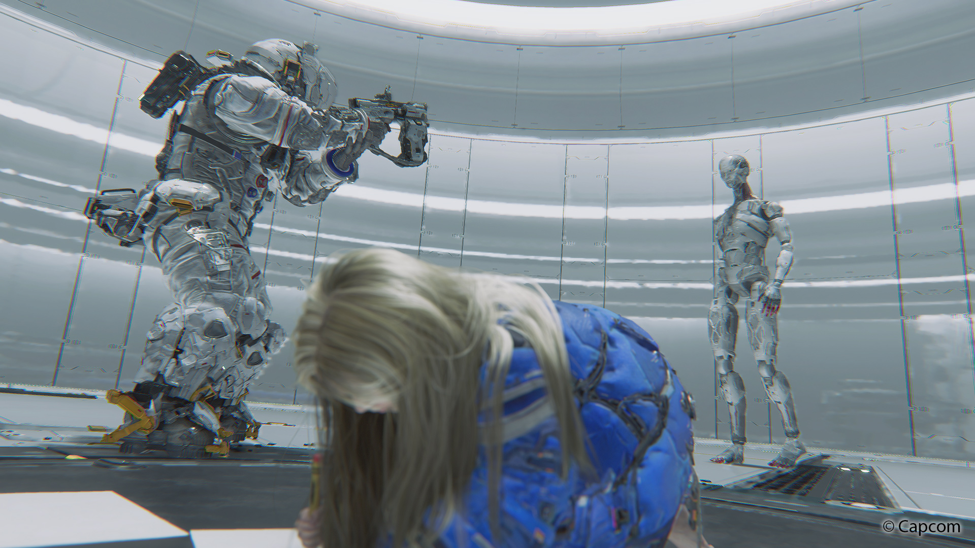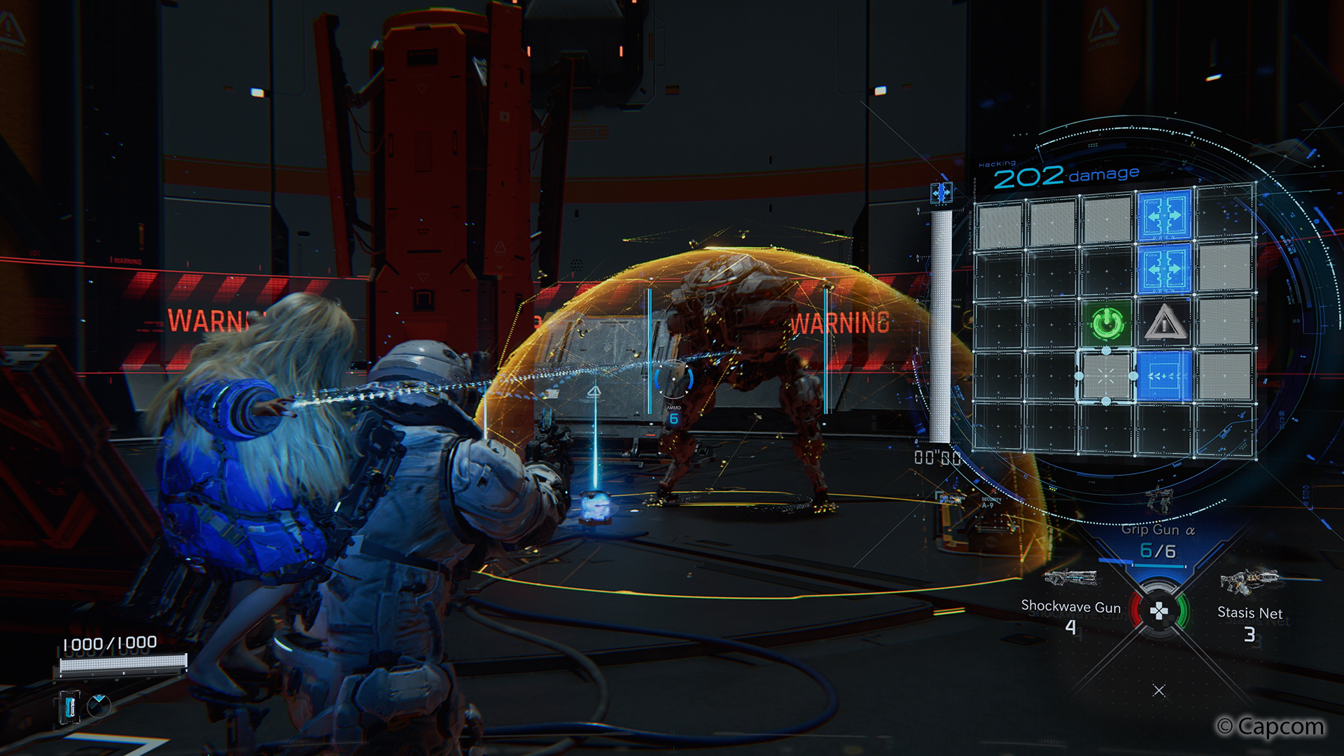 Je besser das periphere Sehvermögen ausgeprägt ist, desto einfacher wird’s. Allerdings zeigt sich Pragmata auffällig gnädig bei feindlichen Attacken, um auch weniger multitaskingfähigen Spielern Zeit zu geben, sich auf das Hacken zu konzentrieren. Später wird zudem eine Auto-Hack-Funktion verfügbar, die sich jedoch eines Ladebalkens bedient und damit nicht unendlich zur Verfügung steht.