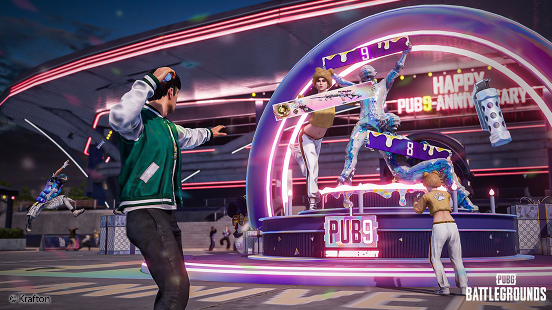 Auch neun Jahre nach der Veröffentlichung wird „PUBG: Battlegrounds“ weiterhin mit neuen Inhalten und Veranstaltungen für die weltweite Community erweitert. Zum Jubiläum wurden verschiedene thematische Elemente direkt in die Spielwelt integriert. Auf der Startinsel befindet sich eine spezielle Statue, die an den Jahrestag erinnert und mit der Spieler vor Beginn einer Runde interagieren können. Wird die Statue mit neun holografischen Blendgranatenwürfen erfolgreich getroffen, verändert sie ihr Erscheinungsbild und nimmt die Gestalt der jeweiligen Spielfigur an.