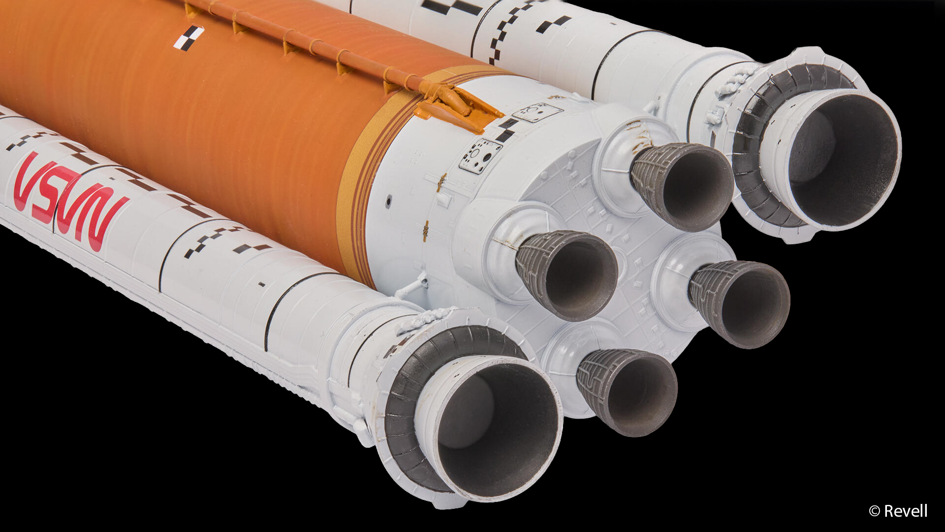 Die bei diesem Revell-Modell enthaltenen Abziehbilder belegen zwei volle Seiten der Anleitung, was allein schon andeutet, wie viel Beschriftung und Grafik auf der realen SLS zu finden ist. Das Gute ist, dass die Abziehbilder gestochen scharf sind, sauber ausgerichtet und schlicht qualitativ besser sind als bei vergleichbaren Konkurrenzprodukten. Revell liefert hier vollständigere und handhabungsfreundlichere Abziehbilder unter anderem durch vorkolorierte Bereiche, etwa für die charakteristischen orangefarbenen Sektionen der Booster. Das spart Zeit, reduziert Fehlerquellen und das Ergebnis sieht nach dem Aufbringen sauber aus.