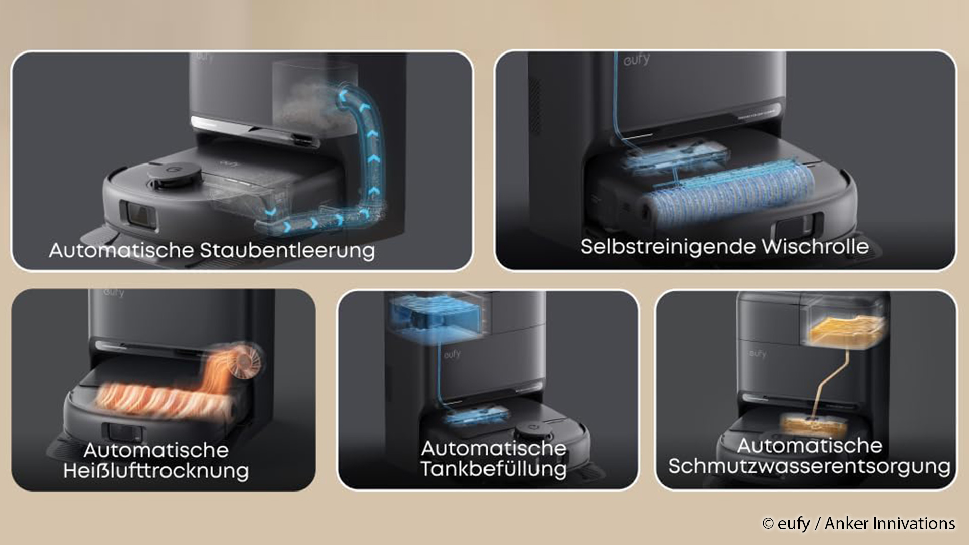 Ein zentrales Ausstattungsmerkmal ist die vollautomatische 5-in-1-Station. Sie übernimmt die Staubentleerung des Roboters, reinigt die Wischrolle, füllt den Wassertank nach, trocknet die Komponenten per Heißluft und entsorgt das anfallende Schmutzwasser. Dadurch reduziert sich der manuelle Pflegeaufwand deutlich und der Roboter kann über längere Zeiträume selbstständig betrieben werden.