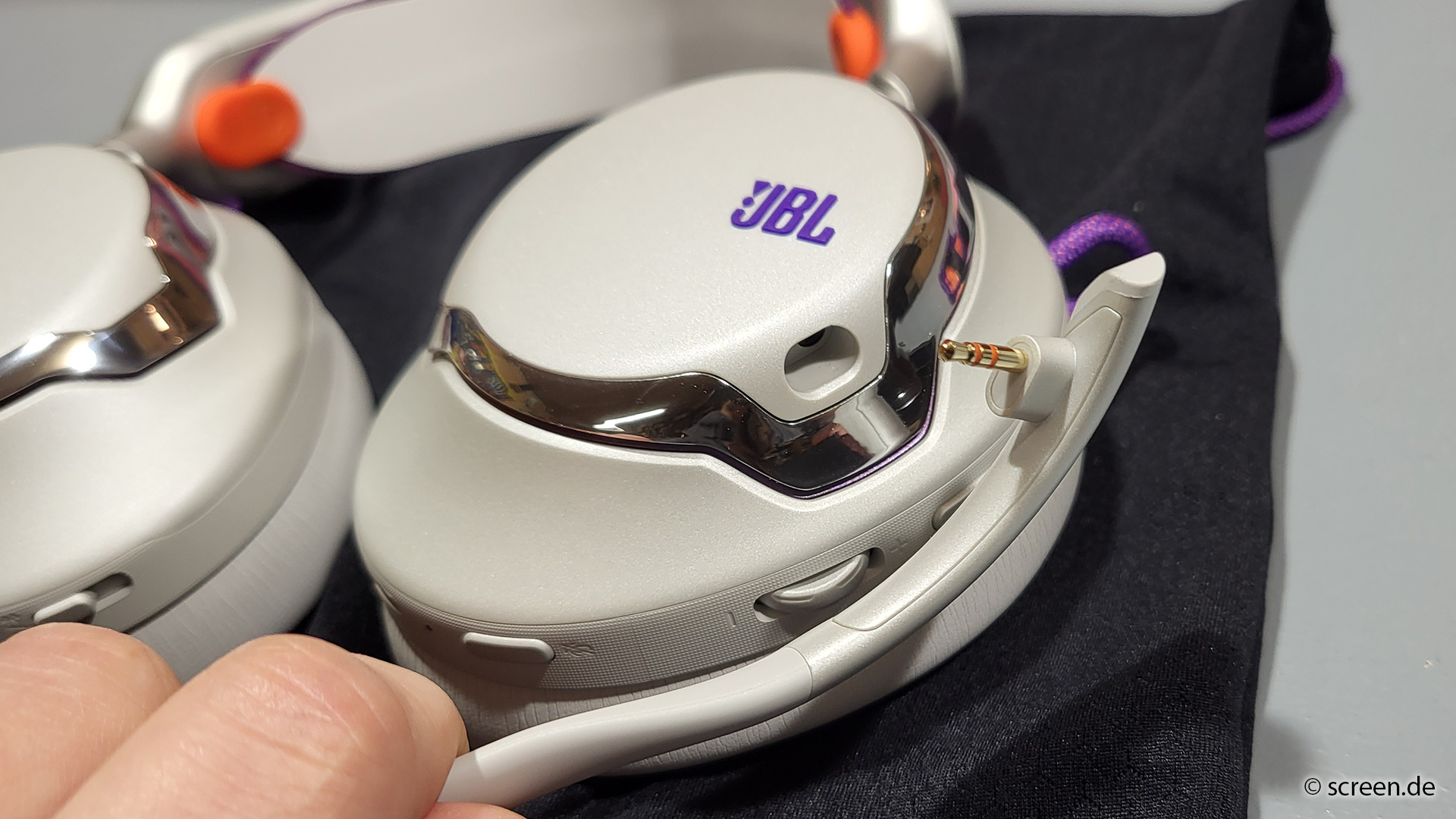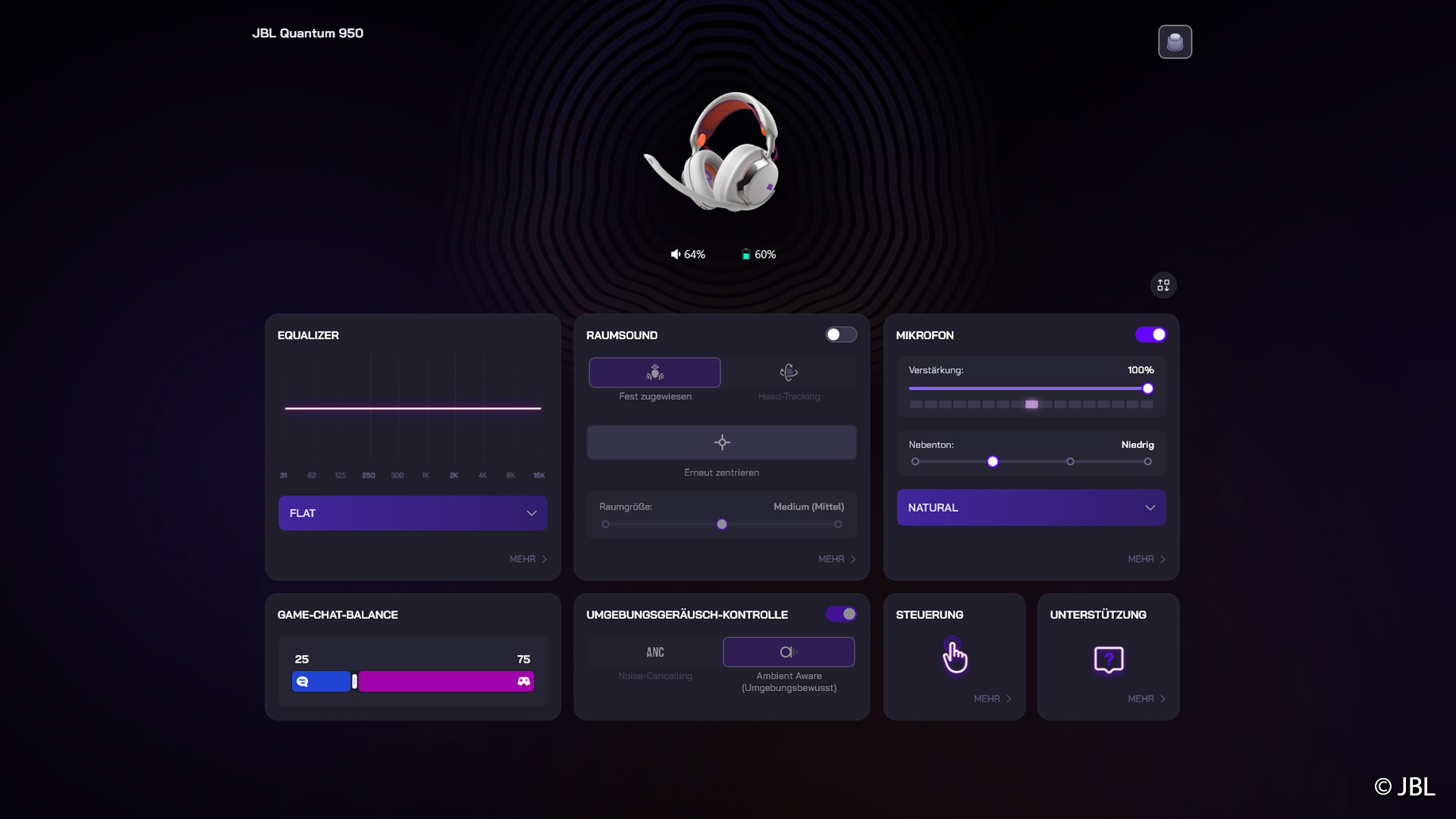 Die Bedienung erfolgt größtenteils direkt am Headset. JBL verteilt die wichtigsten Funktionen sinnvoll auf die Ohrmuscheln und spendiert den prominenten Funktionen eigene Knöpfe, um Doppelbelegungen weitestgehend zu vermeiden: Lautstärke und Chat-Audio haben gut ertastbare, stufenlose Drehregler, ANC-Steuerung und Raumsound sitzen jeweils darüber, Mikrofon-Stummschaltung und der Wechsel der Audioquelle positionieren sich unten an den Ohrmuscheln.