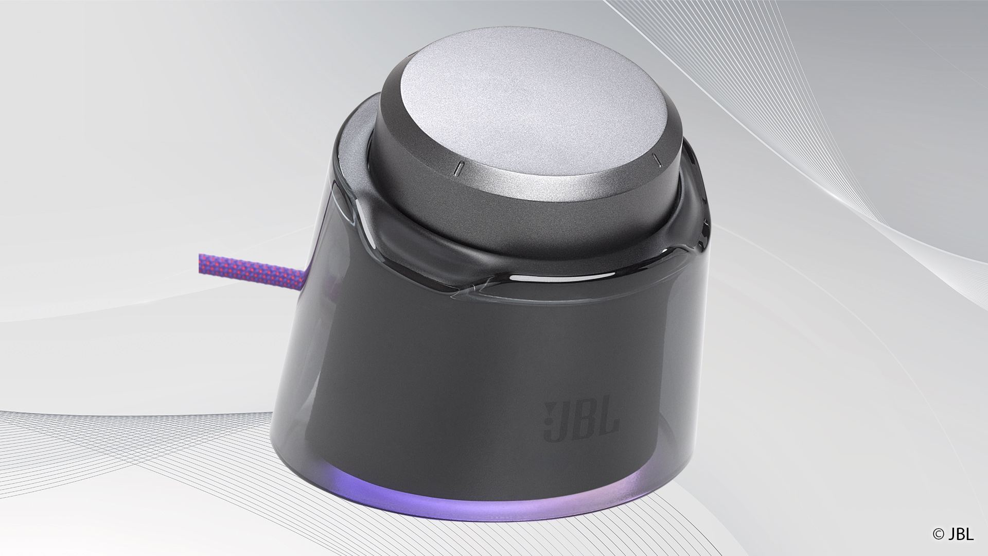 Ergänzt wird das Ganze durch die Basisstation, über welche die wesentlichen Funktionen ebenfalls zugänglich sind. Allerdings liegt der Fokus klar auf Funktionalität. Eine vollwertige Steuerzentrale mit Bildschirm und komplexen Menüs, wie im Falle des Arctis Nova Pro, liefert JBL hier nicht. Zur Bedienung gibt es lediglich einen großen Drehknopf, der sich uns durch das angeschrägte Gehäuse entgegenneigt, ein LED-Ring gibt Aufschluss über den Betriebszustand.