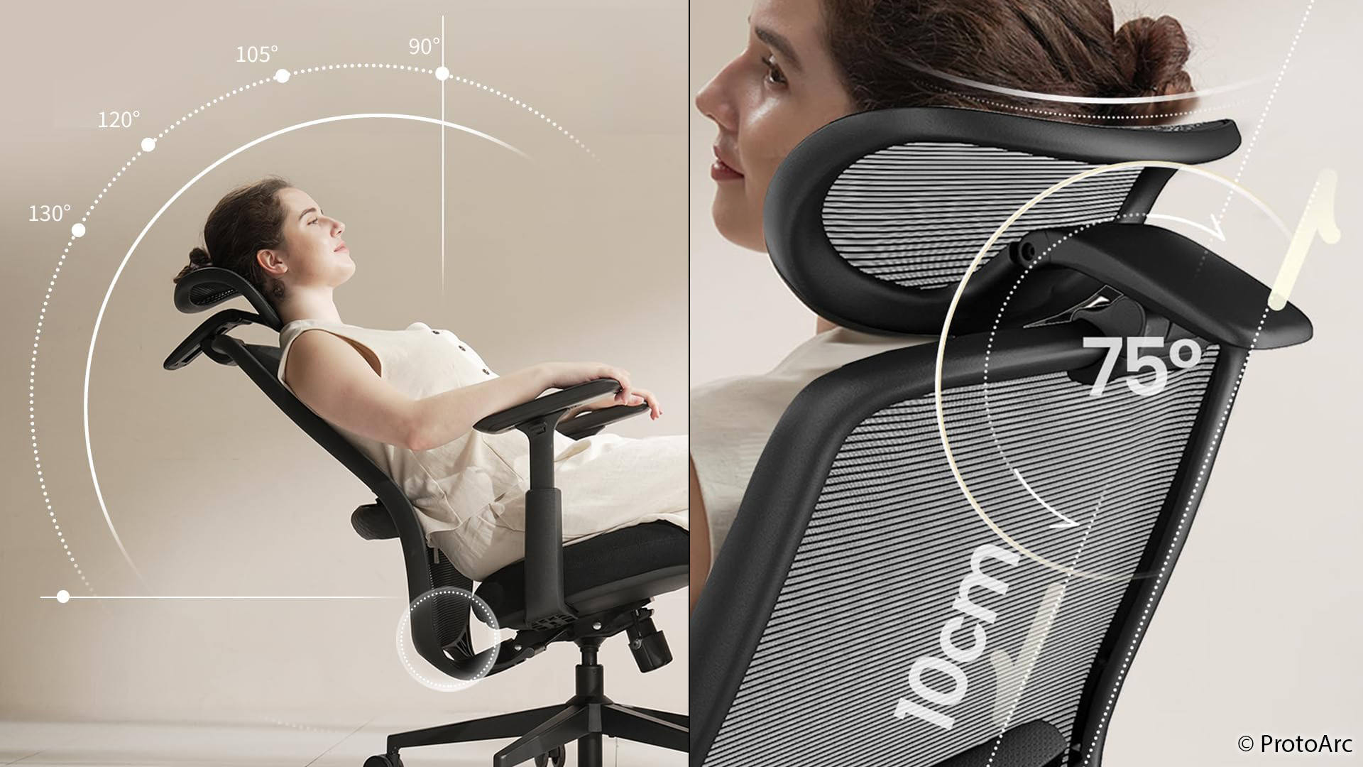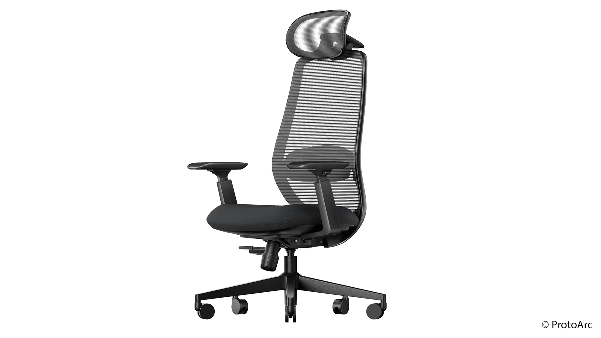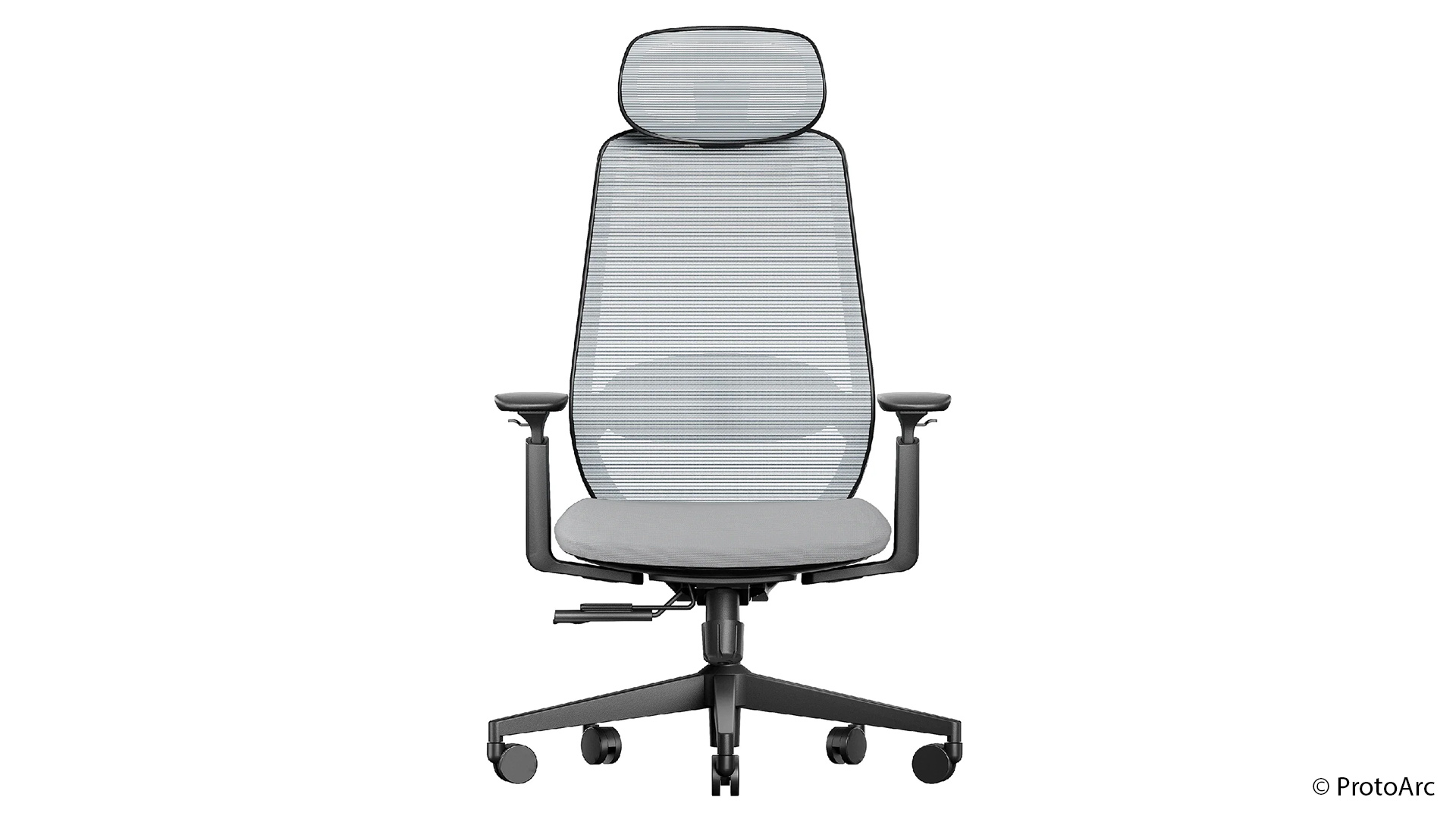 Vier Positionen – 90, 105, 120 und 130 Grad – lassen sich arretieren. Zusätzlich kann die Lehne frei beweglich genutzt werden. Der dazugehörige Hebel ragt seitlich unter der Sitzfläche hervor, ist gut zu erreichen und dient außerdem der Höhenverstellung, die sich laut ProtoArc an Personen zwischen 163 und 190 cm Körpergröße richtet.