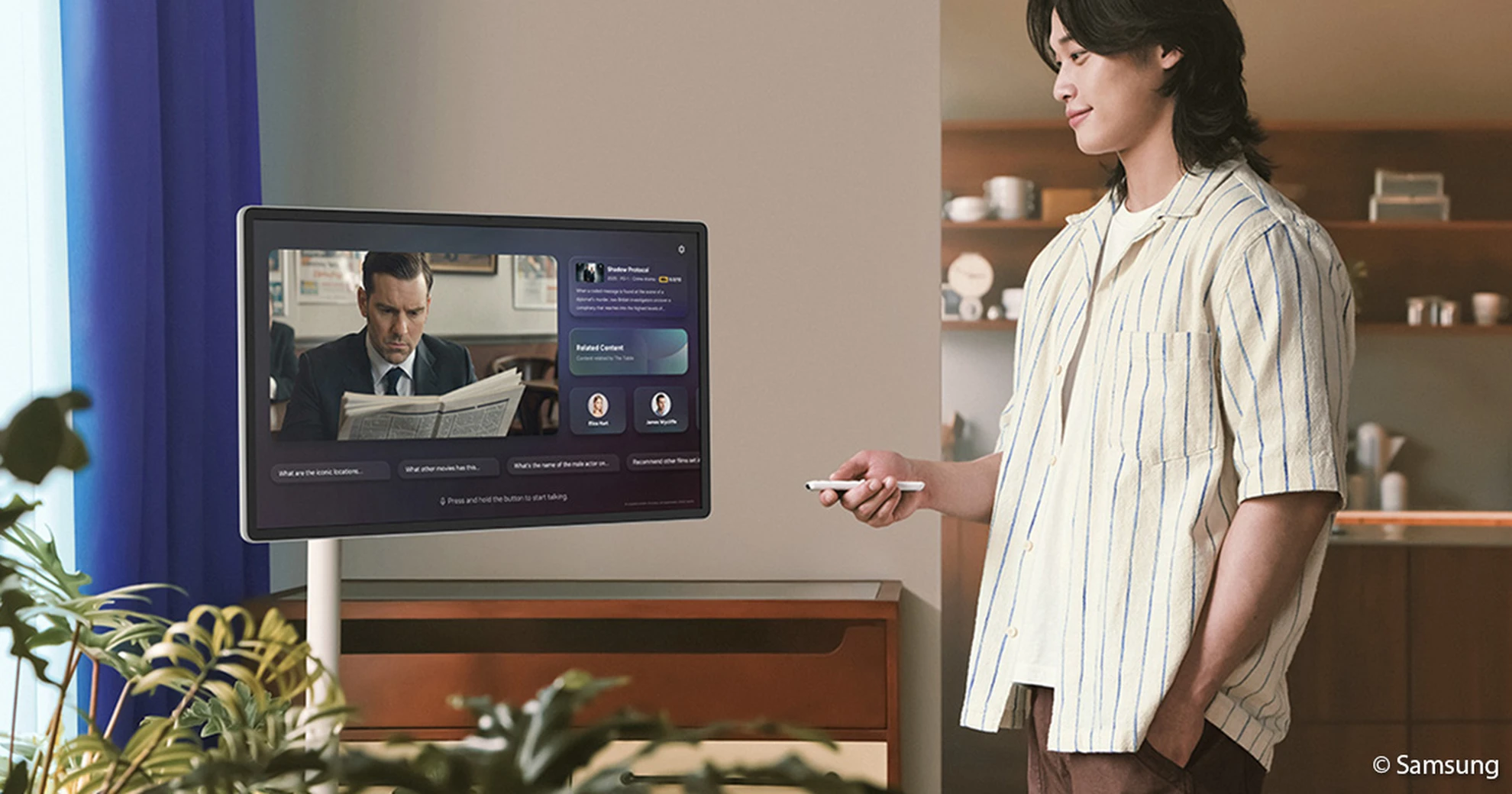 Zur weiteren Ausstattung gehört der Vision AI Companion, der per Sprachbefehl Fragen zu Inhalten oder Alltagsinformationen beantwortet. Die Sprachsteuerung erfolgt über den integrierten Assistenten „Bixby“. Alternativ kann der Touchscreen direkt per Finger bedient werden. Inhalte von kompatiblen Galaxy-Geräten lassen sich drahtlos übertragen, zusätzlich stehen Anschlüsse für USB-C und HDMI zur Verfügung.