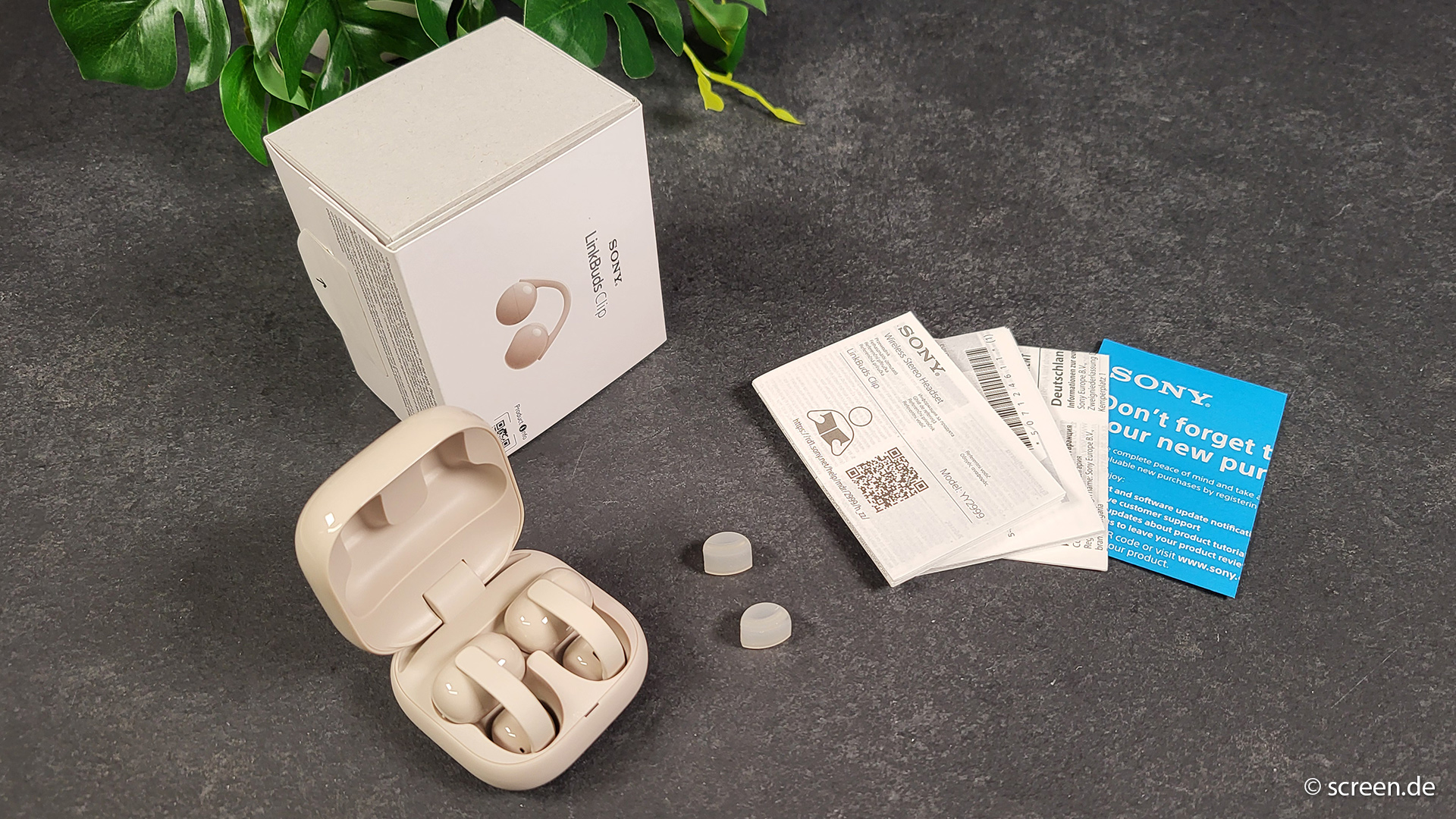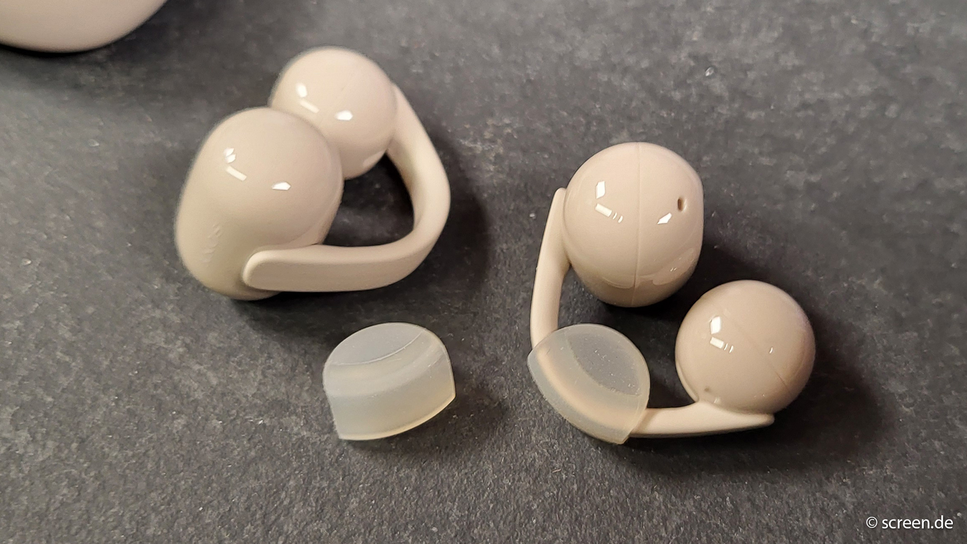 Der Halt ist insgesamt solide, hängt jedoch stark von der individuellen Ohrform ab. Bei normalen Bewegungen sitzen die LinkBuds Clip sicher, bei intensiveren Aktivitäten kann es je nach Passform zu leichtem Verrutschen kommen. Sony weiß das und legt deshalb zusätzliche Silikonaufsätze bei, mit denen sich der Sitz effektiv anpassen und stabilisieren lässt, auch wenn dies ein wenig zulasten des Tragekomforts geht.