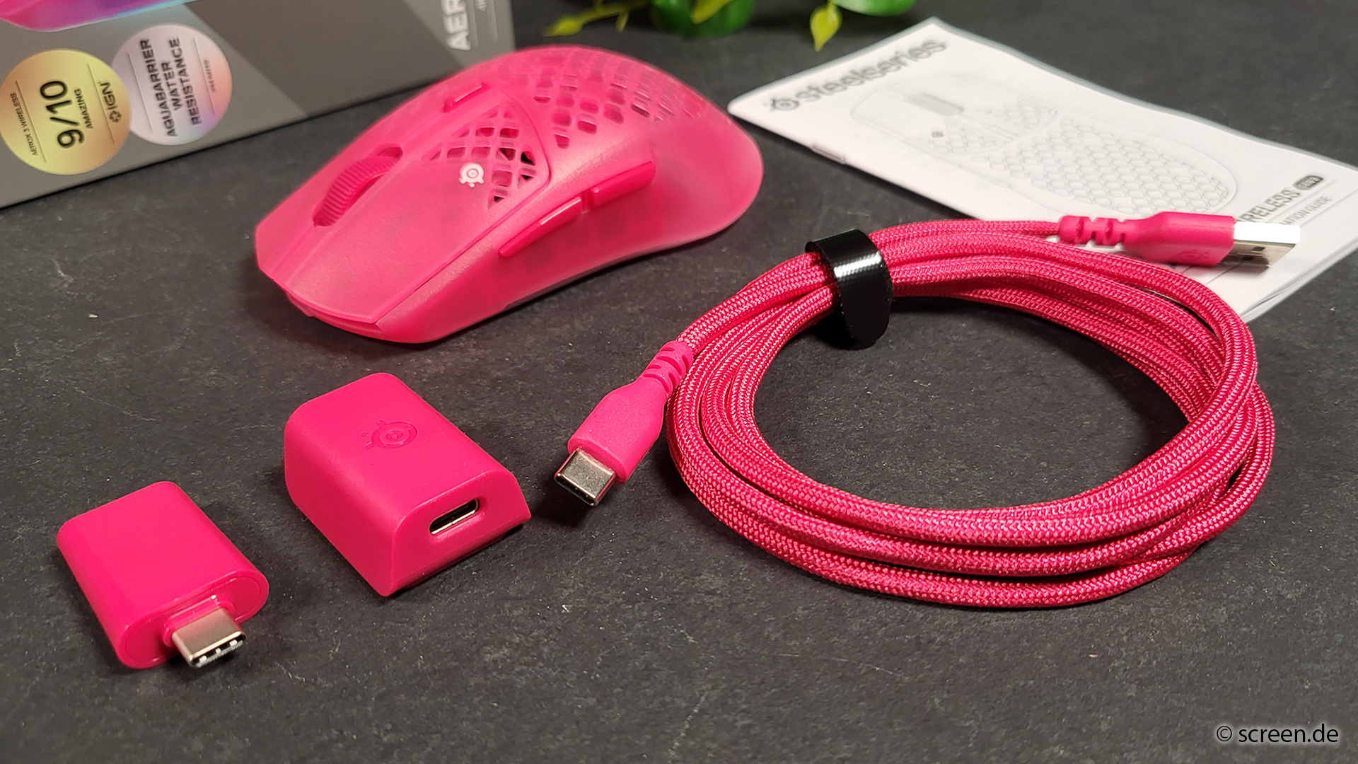 Abgerundet wird das Gesamtpaket durch flexible Anschlussmöglichkeiten. Neben der schnellen 2,4-GHz-Verbindung über den beiliegenden Dongle steht auch Bluetooth zur Verfügung, was die Maus sehr vielseitig macht und sie nicht zuletzt dank des geringen Gewichts auch für den mobilen Einsatz interessant werden lässt. Per USB-C lässt sie sich zudem klassisch kabelgebunden betreiben und laden. Ein farblich passendes, textilummanteltes Kabel liegt bei, ebenso ein praktischer USB-C-Adapter.