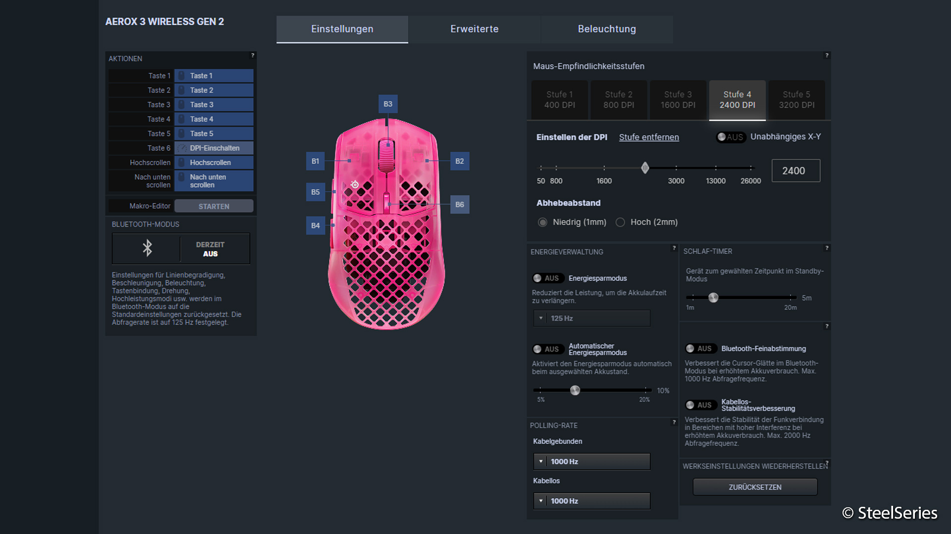 Die Funkverbindung selbst arbeitet zuverlässig. Im Test zeigt sich die 2,4-GHz-Verbindung stabil und latenzarm, ohne Abbrüche oder spürbare Verzögerungen. Für den mobilen Einsatz steht zusätzlich Bluetooth zur Verfügung, Mit deutlich geringerer Abtastrate gibt sich die Aerox 3 Wireless Gen 2 hier weniger performant, dafür aber sparsamer und unkompliziert im Wechsel zwischen mehreren Geräten.
