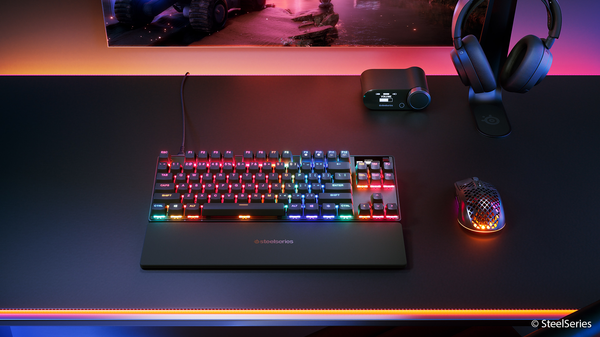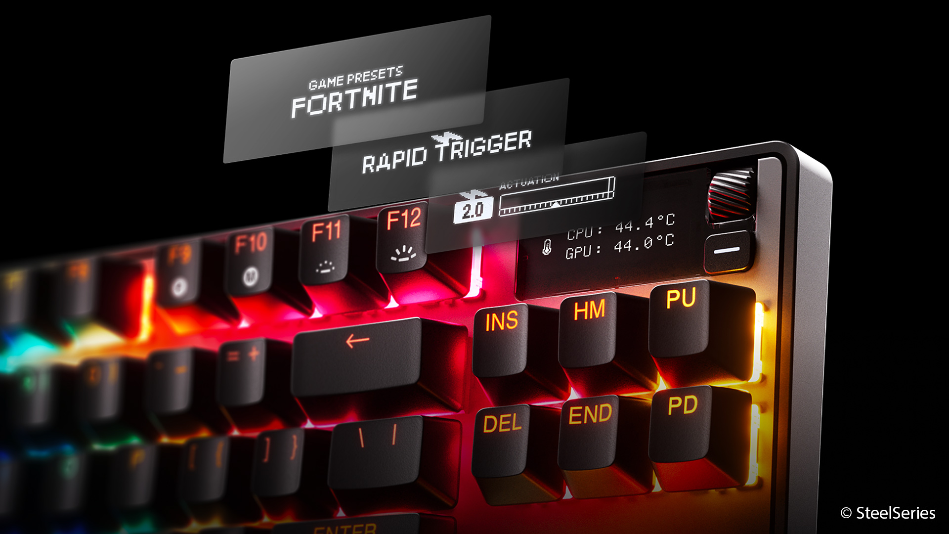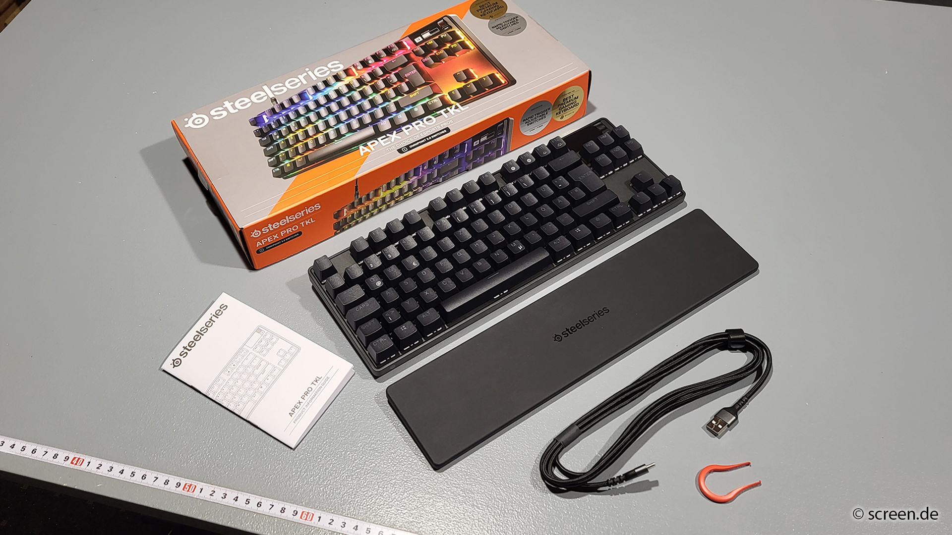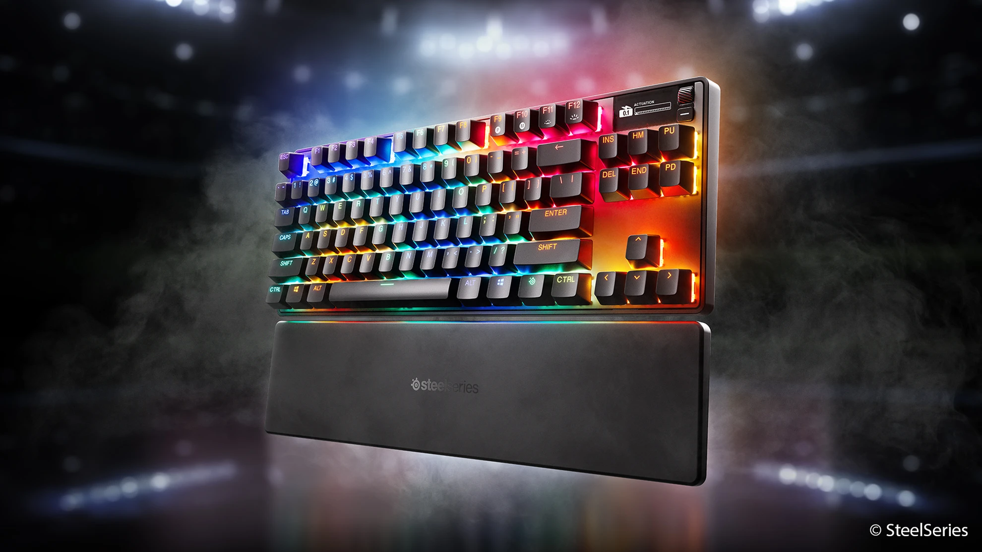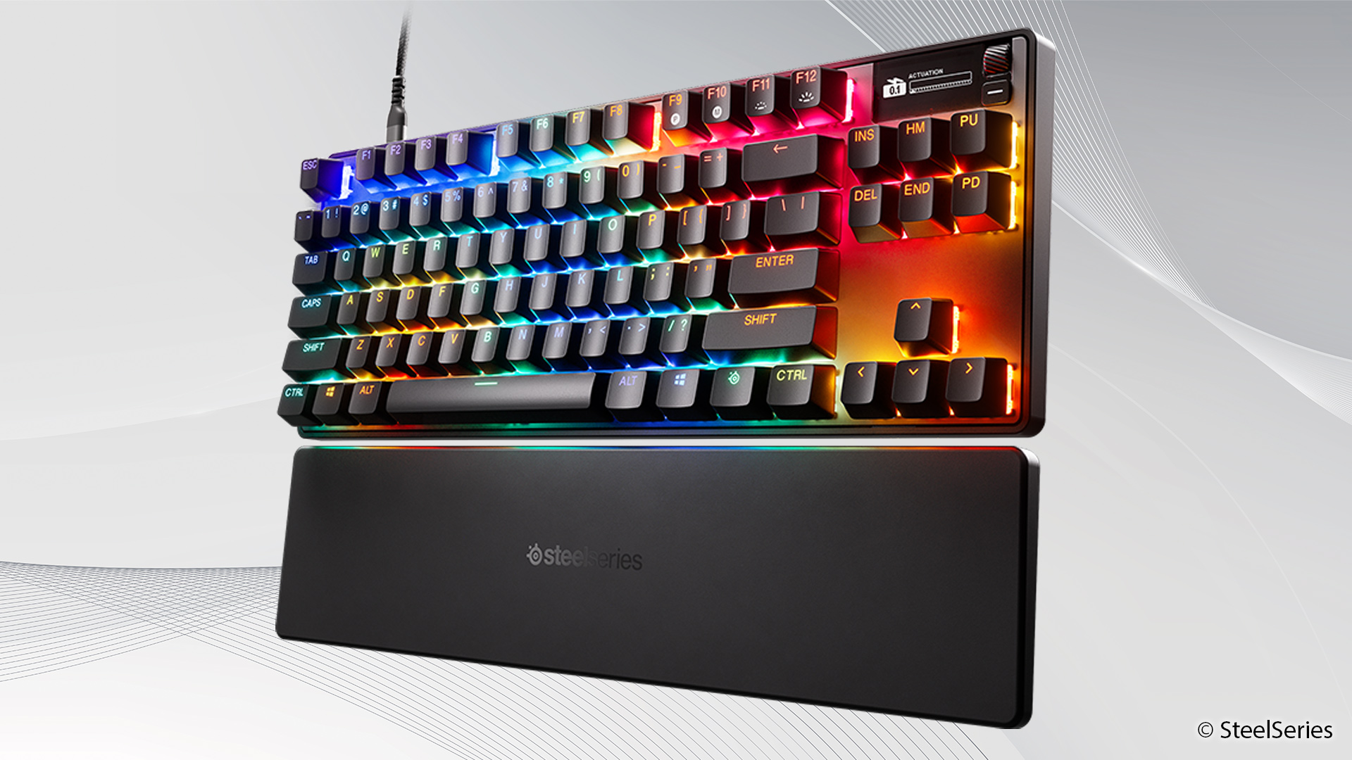 Technisch bewegt sich die Apex Pro TKL Gen 3 ansonsten auf dem für moderne Gaming-Keyboards üblichen Niveau. Die Polling-Rate liegt bei bis zu 1.000 Hertz, N-Key-Rollover und Anti-Ghosting gehören ebenfalls zur Ausstattung. Hinzu kommen eine pro Taste steuerbare RGB-Beleuchtung sowie ein kleines OLED-Display, das Informationen direkt auf der Tastatur anzeigen kann.