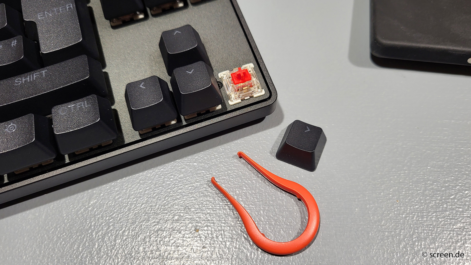 Zum Lieferumfang gehört außerdem eine magnetische Handballenauflage. Sie rastet magnetisch an der Unterseite der Tastatur ein und sorgt für eine deutlich entspanntere Handhaltung bei längeren Gaming- oder Schreibsessions, könnte für unseren Geschmack aber gerne etwas fester haften. Hinter einer Gummilasche an der Unterseite verborgen befindet sich zudem ein Werkzeug zum Entfernen der Tastenkappen, um diese beispielsweise zur Reinigung oder zum Austausch unkompliziert abziehen zu können.