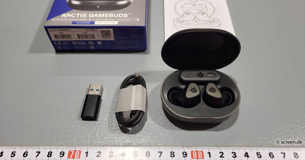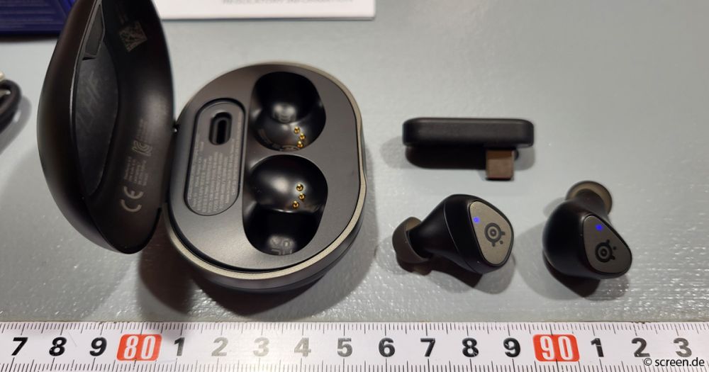 Für 169,99 Euro erhaltet ihr die jeweils 5,3 Gramm leichten Ohrhörer in einem kompakten Case wahlweise in den Farben Weiß oder Schwarz. Auch der USB-C-Nano-Dongle für die 2,4-GHz-Funkverbindung findet in der Ladehülle Platz. Zum Lieferumfang gehören neben dem üblichen Papierkram außerdem noch ein USB-C-auf-USB-A-Adapter, ein USB-C-Ladekabel (0,3 m) und zwei weitere Größenpaare an Silikonaufsätzen, die wir beim Auspacken fast übersehen hätten.