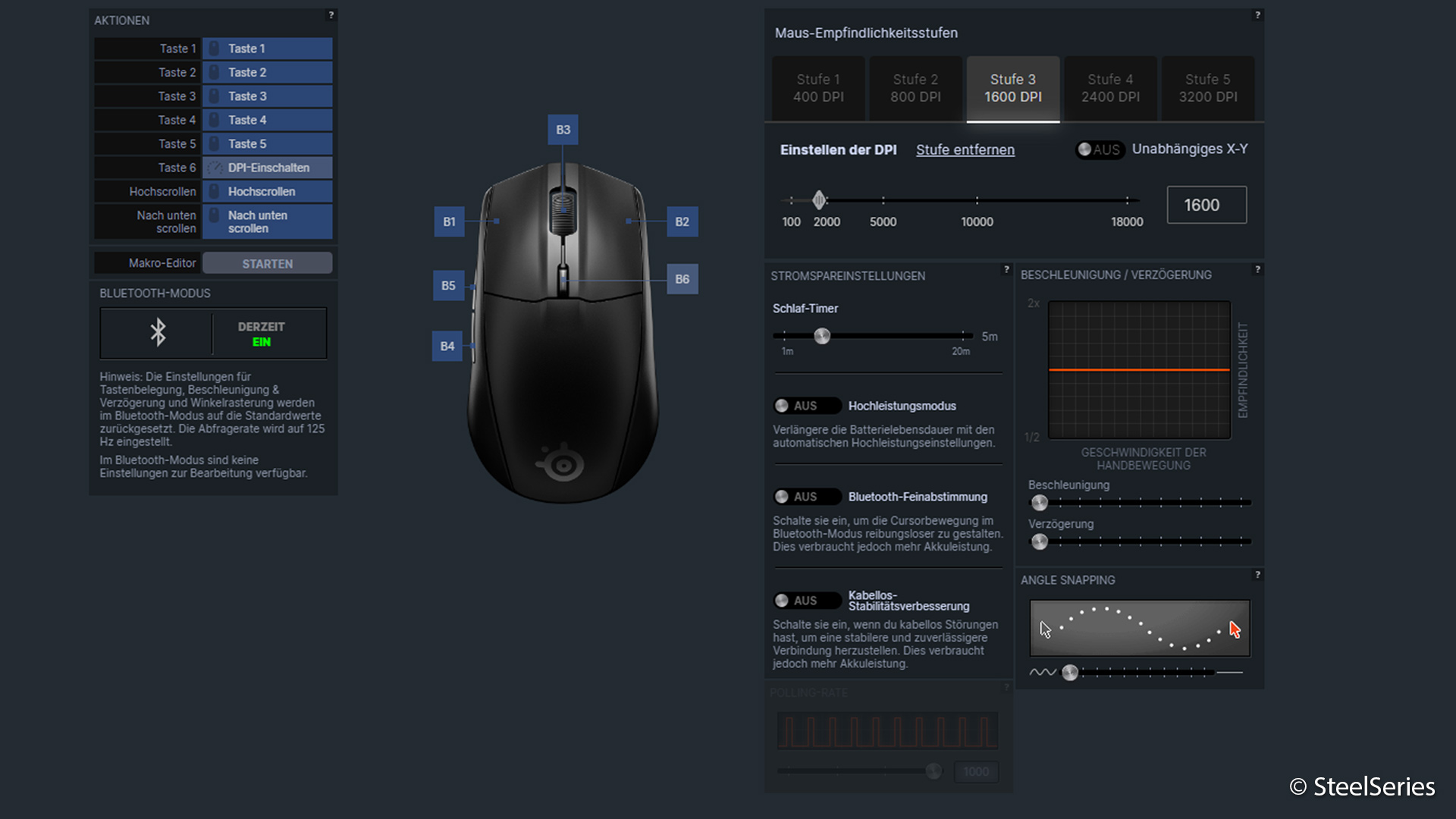 Konfiguriert wird die Maus über die SteelSeries-GG-Software. Dort lassen sich sämtliche Tasten neu belegen, Makros erstellen oder verschiedene DPI-Stufen über die fünf werkseitig voreingestellten Werte hinaus definieren. Auch Profile für unterschiedliche Anwendungen können angelegt werden.