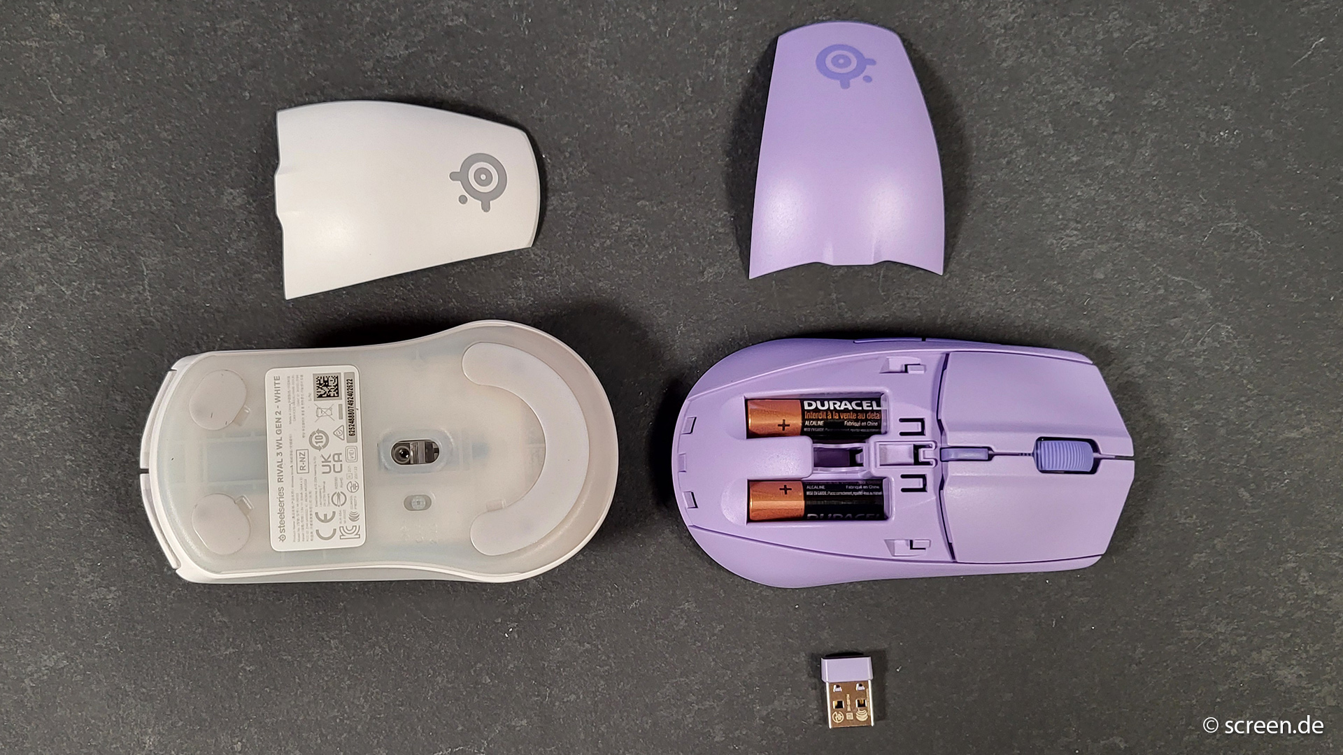Tatsächlich wirkt die Maus sogar im besten Sinne massiv, was sich auch beim Gewicht zeigt. Mit zwei eingesetzten AAA-Batterien bringt die Rival 3 Wireless Gen 2 etwa 106 Gramm auf die Waage. Das ist im Vergleich zu typischen Gaming-Mäusen schon eher wuchtig. Wem das zu viel ist, der kann die Maus aber auch mit nur einer Batterie betreiben. Klingt schräg, klappt aber und reduziert das Gewicht auf rund 95 Gramm.
