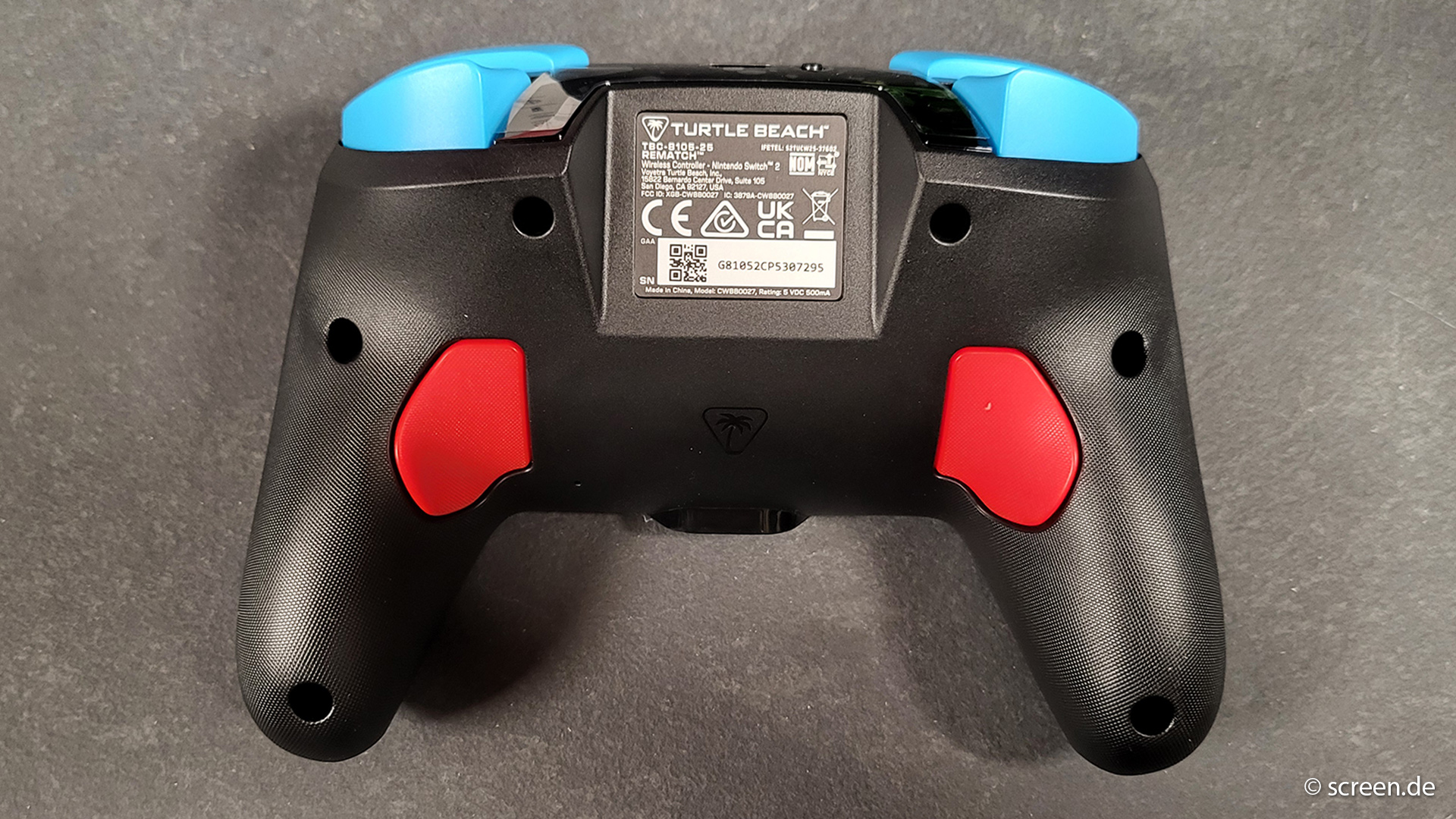 Die frei belegbaren rückseitigen Trigger sind relativ flach in das Pad-Design integriert und großflächig gestaltet, um sie mit verschiedenen Fingern bedienen zu können. Für eine perfekte Ergonomie hätten sie allerdings gerne etwas weiter hervorstehen können.