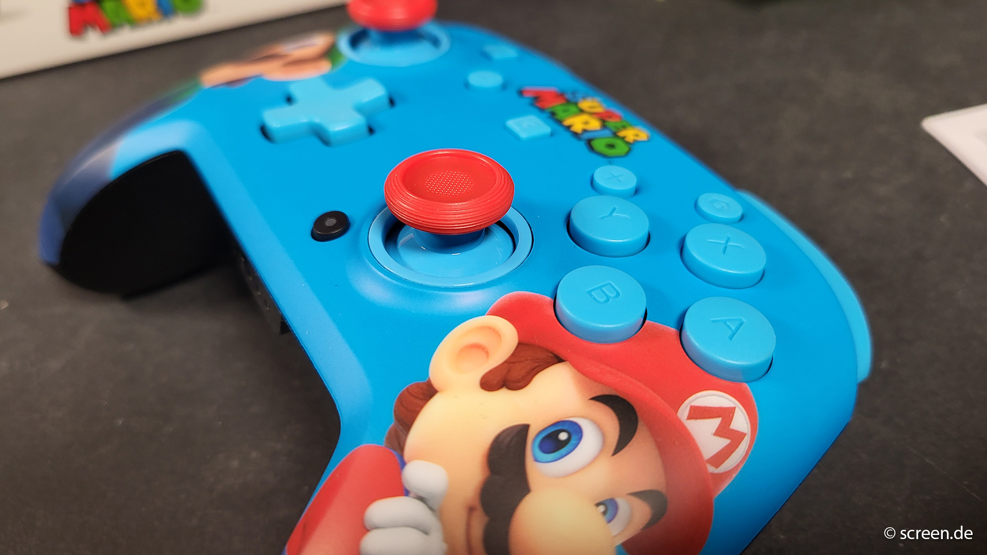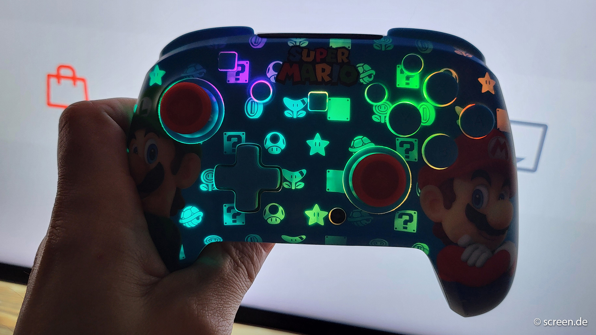 Die Rematch-Reihe wurde bereits mit verschiedenen Nintendo-Motiven aufgelegt – unter anderem in cooler Wackelbild-Optik. Das neue Modell setzt nun nicht nur das berühmte Brüderpaar prominent in Szene, sondern macht dank RGB-Beleuchtung auch diverse Mario-Items in Iconform auf der Front des Pads sichtbar. Fraglos trägt das nichts zum Spielerlebnis bei – ein enorm charmanter Hingucker ist es aber allemal. Vier Beleuchtungsmodi stehen zur Auswahl, die über eine Kombination aus Schulterbuttons und Funktionstaste gesteuert werden.