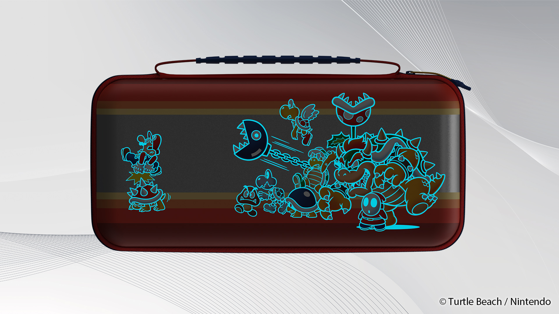 Das Design des Etuis orientiert sich ebenfalls an der Koopa-Thematik und beinhaltet Elemente, die im Dunkeln sichtbar sind. Neben der Schutzfunktion steht die Transportfähigkeit im Vordergrund, um die Konsole unterwegs sicher aufzubewahren. Wie die Controller setzt auch das Etui auf eine Kombination aus funktionalen und gestalterischen Aspekten.